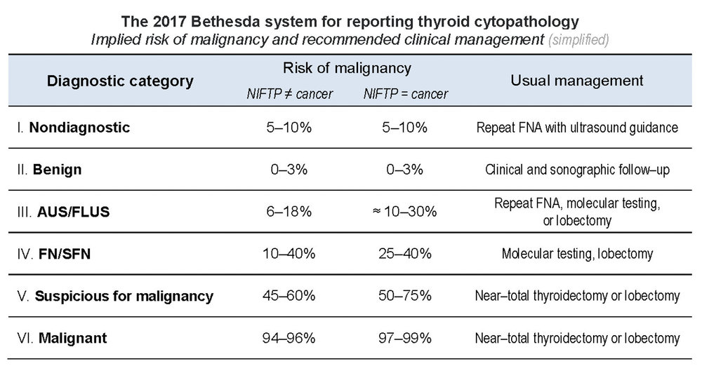 The Bethesda System provides a standardized way for pathologists and doctors to interpret and act on thyroid biopsy results. Here's what each category means: