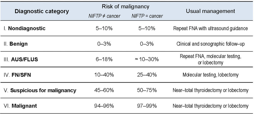 Figure 2: Outlines the Bethesda System, which guides the next steps after a thyroid biopsy based on six diagnostic categories ranging from nondiagnostic to malignant.